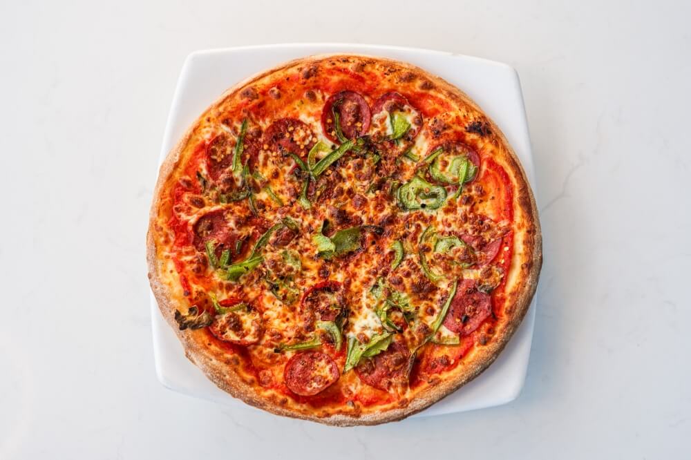 Napoli sauce, Mozzarella cheese, Salami, Capsicum, Chilli flakes