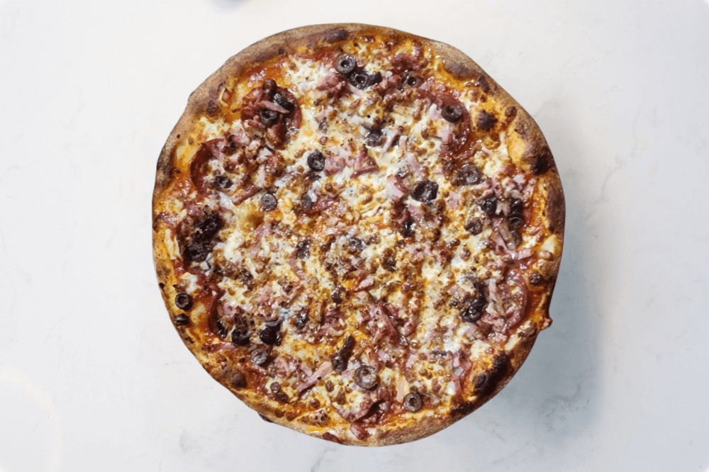 Napoli Sauce, Mozzarella cheese, Salami, Bacon, Olives, Anchovies, Oregano, Garlic