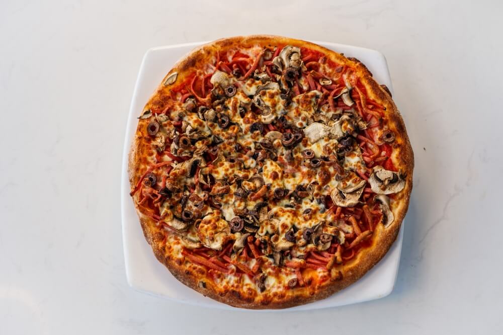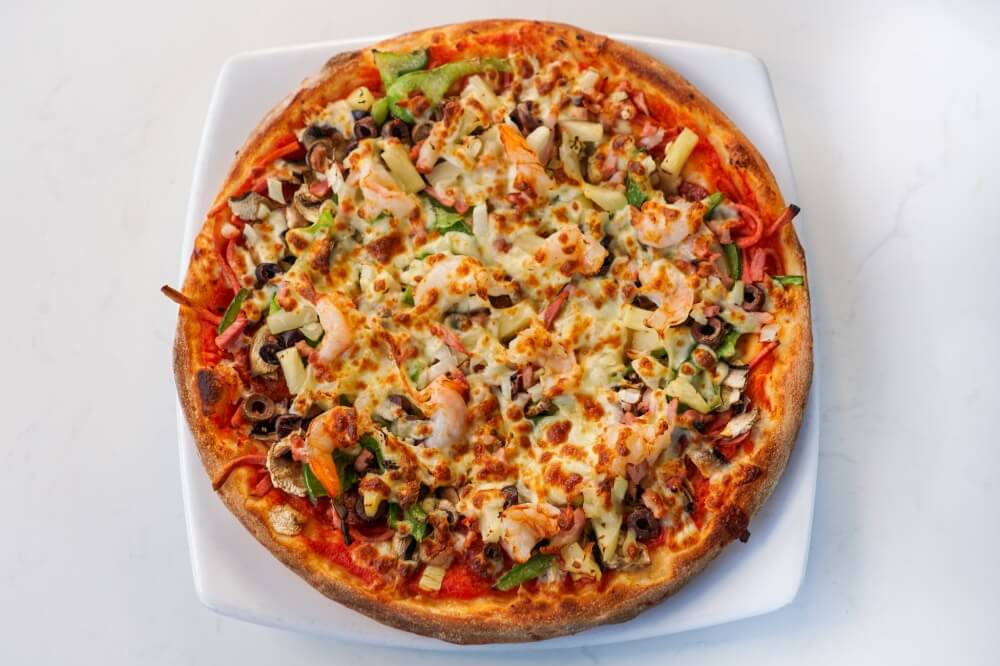 Napoli Sauce, Mozzarella cheese, Ham, Salami, Mushroom, Capsicum, Olives, Pineapple, Bacon, Onion, Prawns, Anchovies
