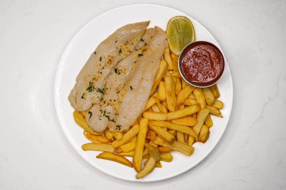Grilled Fish, Chips, Lemon wedge