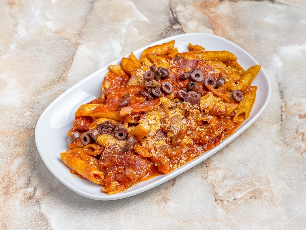 Salami, Olives, Shallots, Chilli Flakes, in a Napoli Sauce