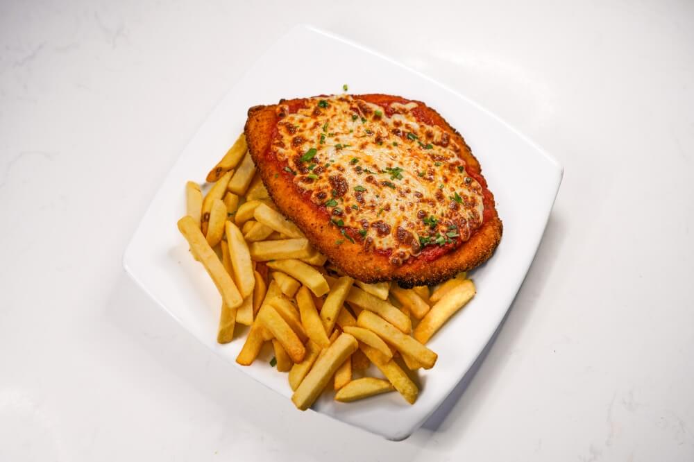 Freshly crumbed chicken breast, Napoli sauce, Mozzarella cheese with a large serving of chips