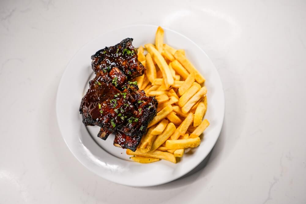 oven cooked BBQ pork ribs. Served with chips.