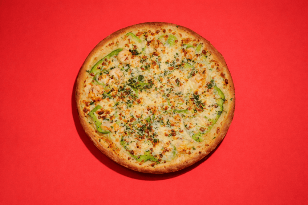 White Cream Base, Mozzarella Cheese, Prawns, Capsicum, Garlic, Chilli, Parsley